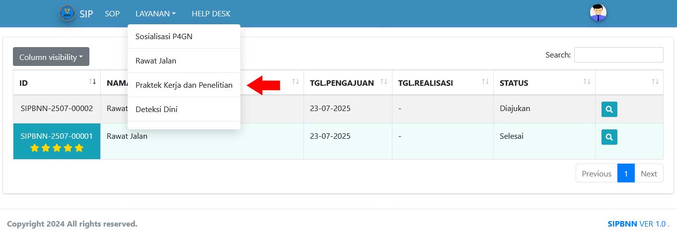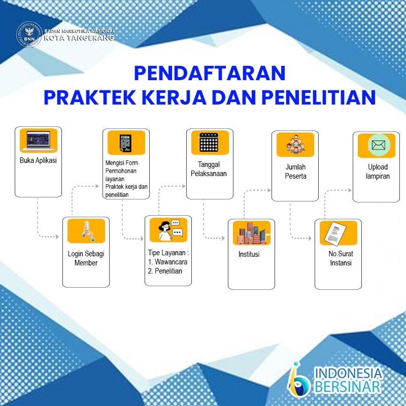 Pada Layanan Praktek Kerja dan Penelitian, member dapat mengusulkan layanan untuk magang kerja selama 2-6 bulan di lingkungan BNN Kota Tangerang melalui aplikasi SIPBNN. Berikut adalah Langkah-langkah untuk mengajukan praktek kerja dan penelitian pada aplikasi SIPBNN, antara lain :