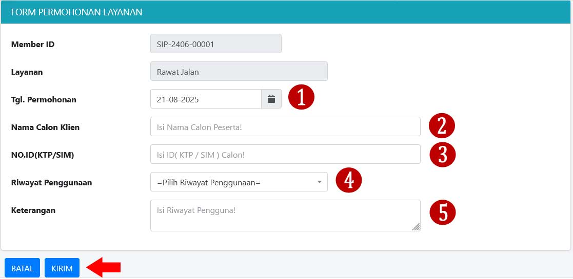 c. Pada halaman form pengajuan layanan rawat jalan, isikan data sebagai berikut :